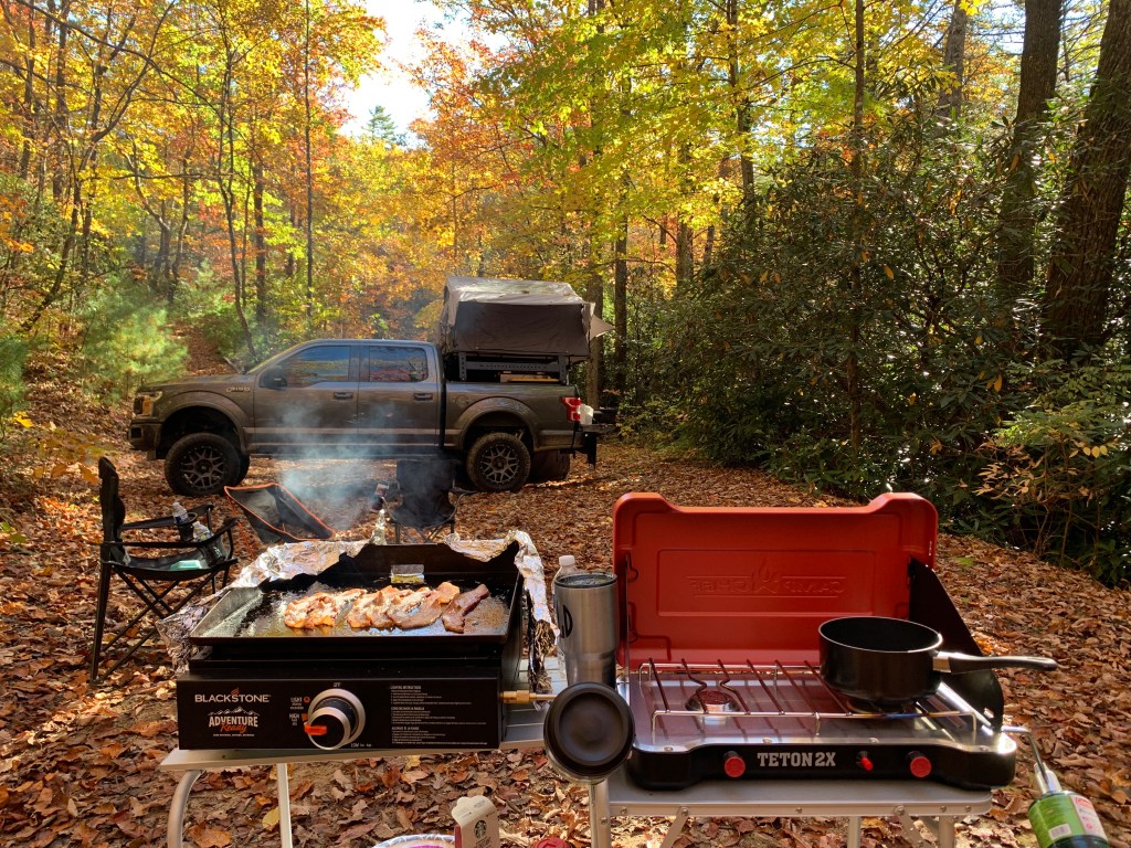 The Blackstone Adventure Ready 17″ Tabletop Outdoor Griddle was an impulse buy but it is definitely the most used cooking item we have. We even use it at home for making fried rice–Amazing! It is a breeze to set-up and breakdown. I don’t like cleaning it up, but Smalls does not mind. Lets face it, he’s the expert at properly seasoning it to make it simple. The best part is the rear grease management system. Get Blackstone’s inserts for quick clean up. It runs off 1# propane cannisters but can be hooked up to larger tank. This griddle puts out 12,000 btu on h shaped burner for even heat distribution. The ignition switch and flame intensity easy to manage. 268 sq in of cooking space. This is our go to for cooking because it is so versatile. We did get the heavy duty backpack to carry it in. The back is waterproof so we feel that it is better to store it in in the back of the truck. I love the backpack straps to make it easier to carry where it needs to go. The side pockets hold propane cannisters and I keep the connector tube in the inside pocket.